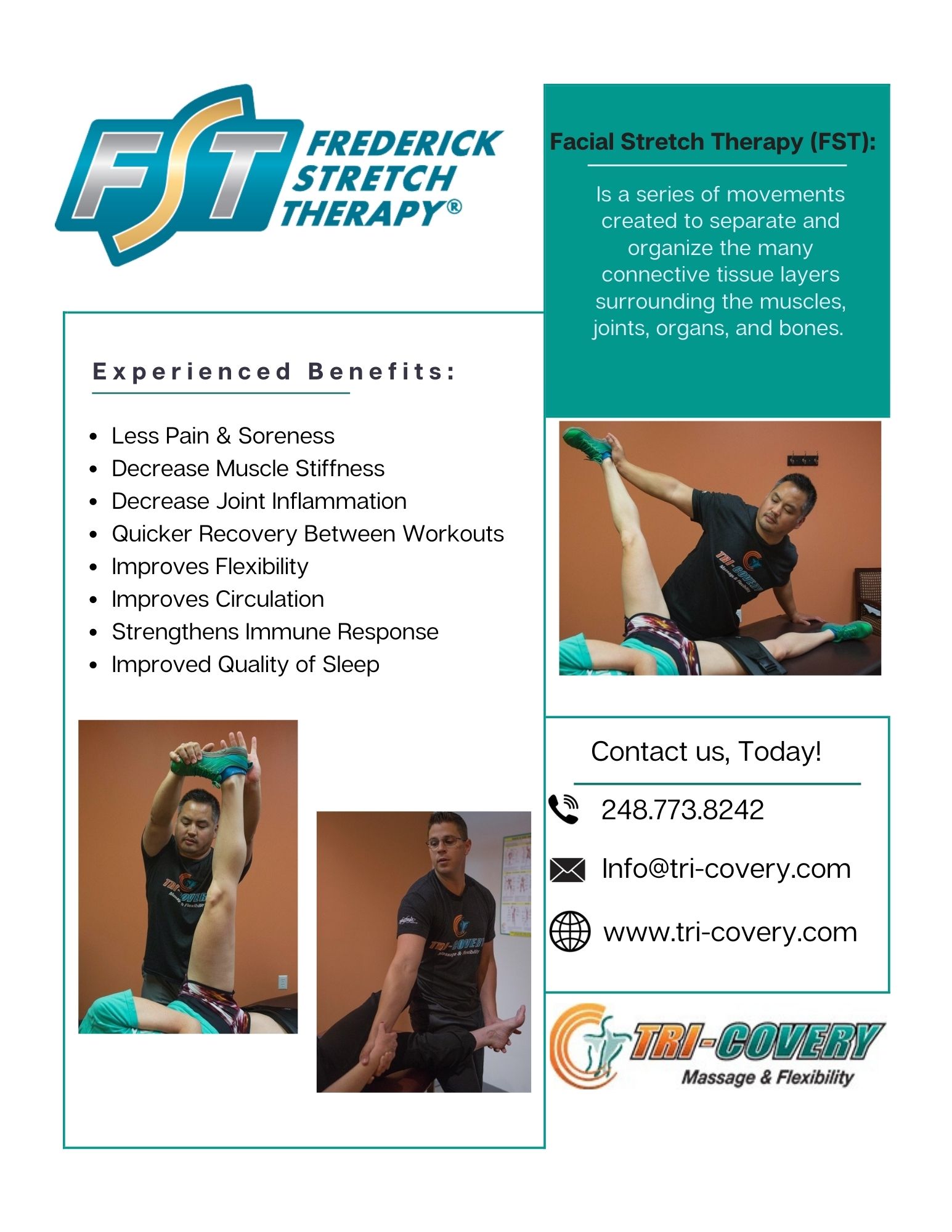 Fascial Stretch Therapy is a neuromyofascial manual therapy method which focuses on the connective tissue system rather than isolated muscle treatment. FST therapists assess active, passive, and resisted range of motion in functional positions and movements. Fascial Stretch Therapy™ is a pain-free, unique, complete, and complementary system of table-based assisted stretching, focusing on the fascia and joint capsule as the key elements in achieving optimal flexibility, strength, performance, and pain relief.